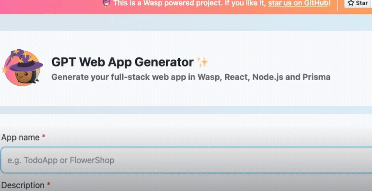 We created GPT Web App Generator, which lets you shortly describe the web app you would like to create, and in a matter of minutes, a full-stack codebase, written in React, Node.js, Prisma, and Wasp, will be generated right in front of you, and available to download and run locally!