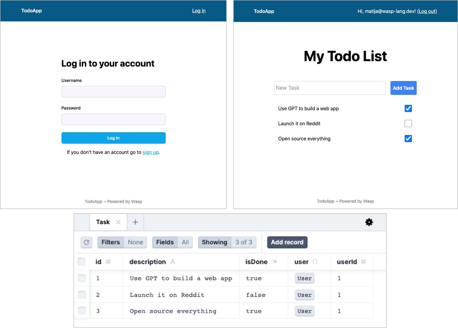 We started this as an experiment, to see how well we could use GPT to generate full-stack web apps in Wasp, the open-source JS web app framework that we are developing. Since we launched, we had more than 3000 apps generated in just a couple of days!