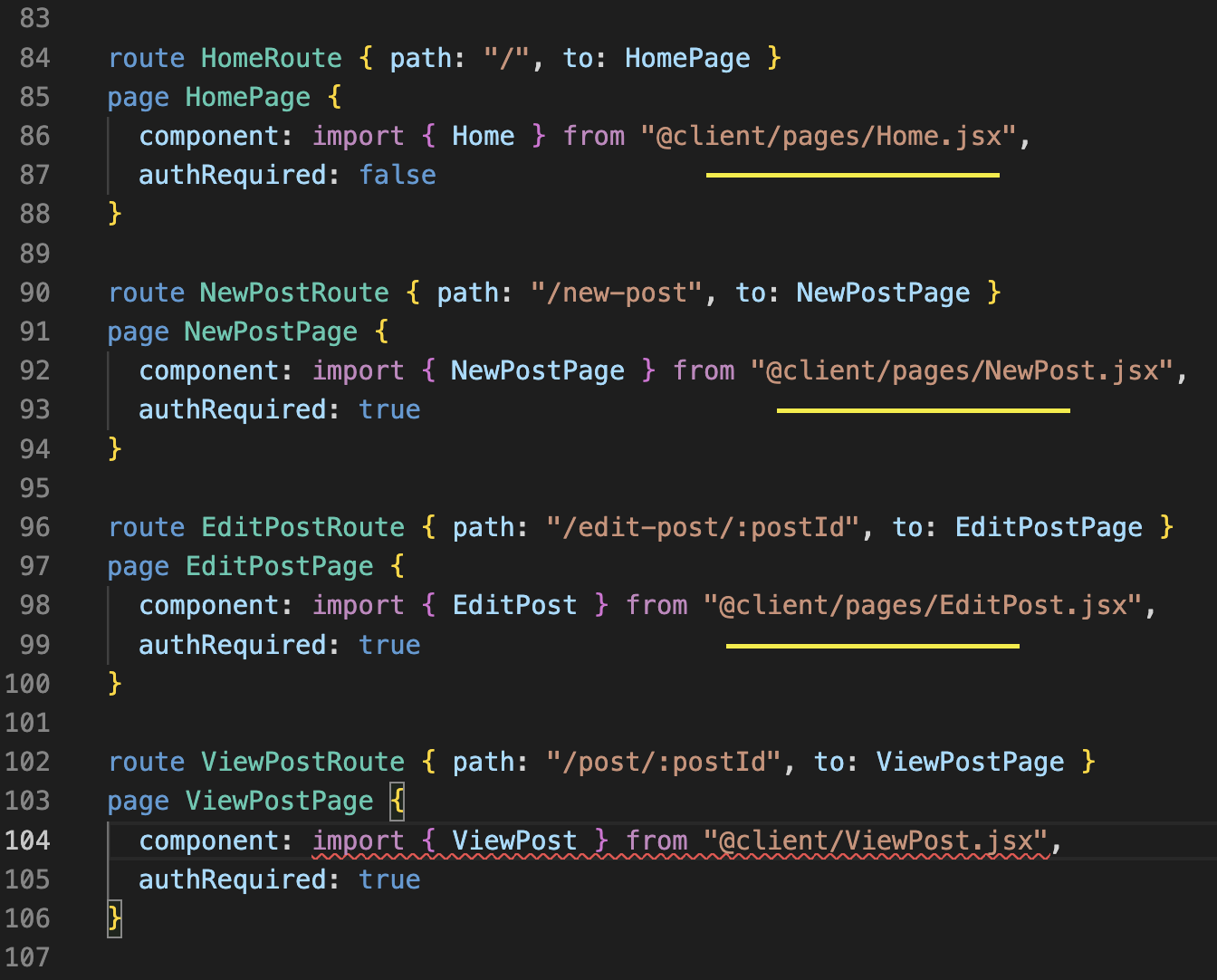 One quick look at the main.wasp file revealed that the Generator gave the wrong path to the ViewPost page, although it did get all the other Page paths correct (highlighted in yellow above).